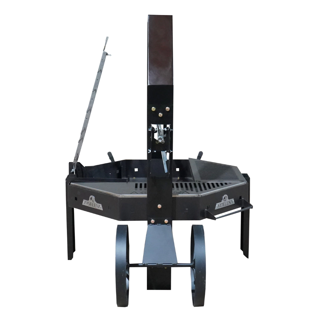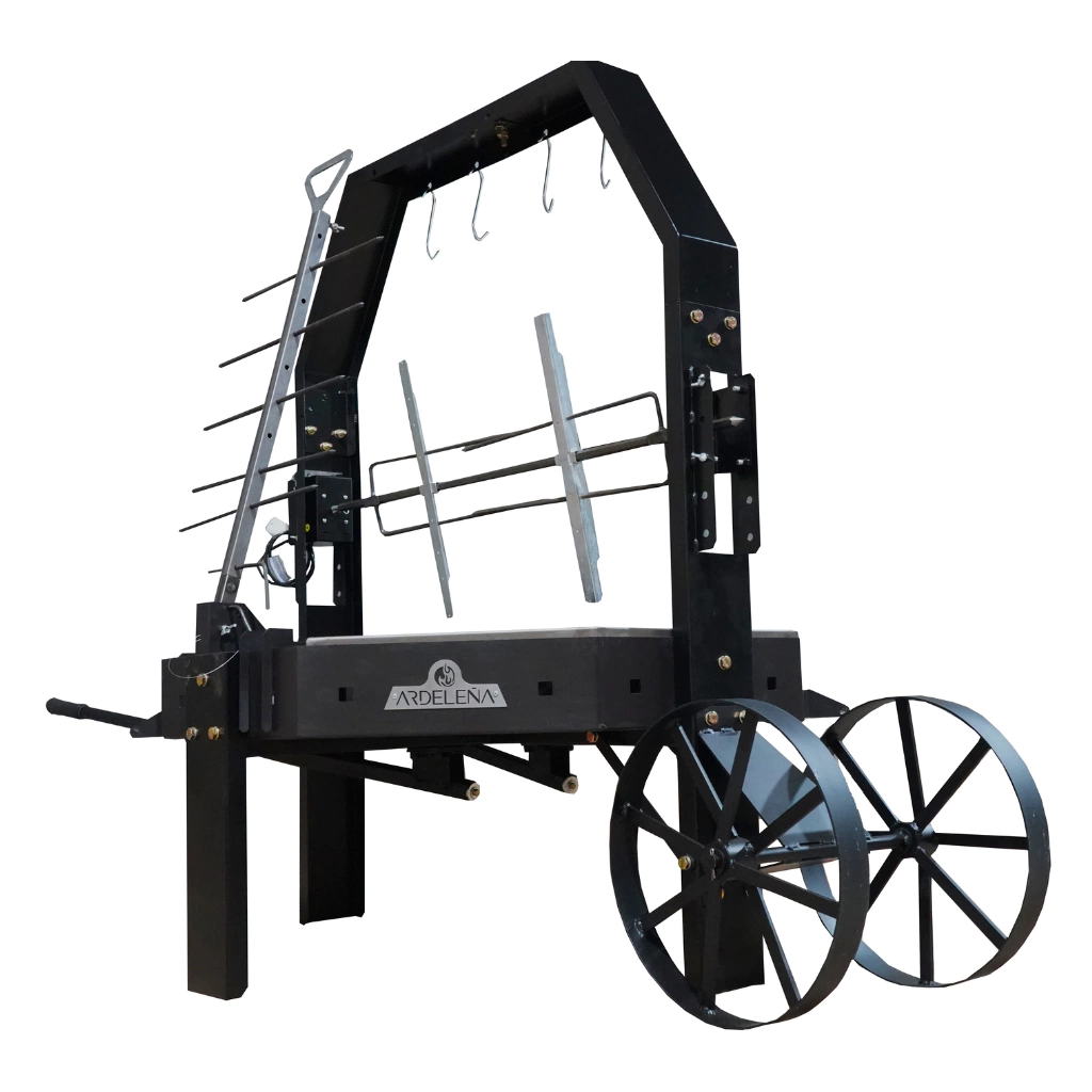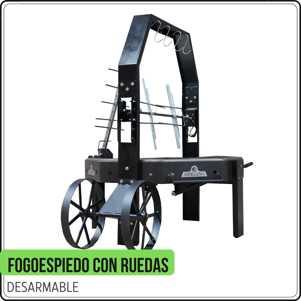 Un solo equipo, muchas formas de asar. El Fogoespiedo Ardeleña combina fogonero de gran porte con espiedo eléctrico regulable en altura, más estaca, parrillas y plancha. Podés cocinar a las brasas o a la llama lateral como en la estaca criolla, y sumarle la rotación continua del espiedo para obtener dorado parejo y jugosidad. Ideal para reuniones grandes: desde cabritos, lechones, corderos, costillares y pollos en el espiedo, hasta cortes a la estaca, verduras a la plancha y grillados simultáneos. Un set modular que te permite elegir la mejor configuración para cada asado.